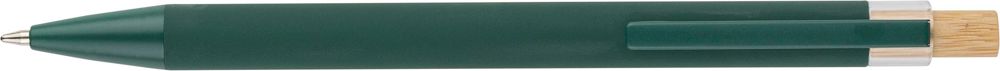 Dieser Kugelschreiber aus recyceltem Aluminium verfügt über einen Druckknopf aus Bambus und ein Detail aus AS-Kunststoff. Er verfügt über einen Metallclip und eine Kunststoffspitze in passenden Farben. Auf dem Schaft befindet sich ein lasergraviertes Recycling-Logo. Die ungefähre Schreiblänge beträgt 800 Meter. Blaue Tinte.