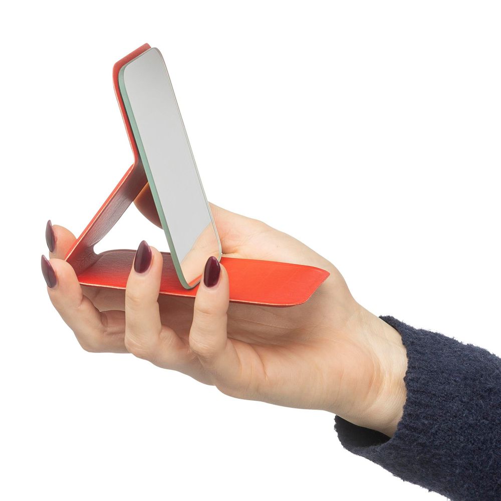 Glasspiegel verfügt über eine klappbare Hülle aus recyceltem PU und bleibt im geöffneten Zustand aufrecht stehen. Mit einer Größe von 70 x 11 cm passt er in jede Tasche und ist in den Farben Schwarz, Weiß und Rot erhältlich. Er verfügt über ein geprägtes Recycling-Logo. Er wird in einer Papiertüte verpackt.