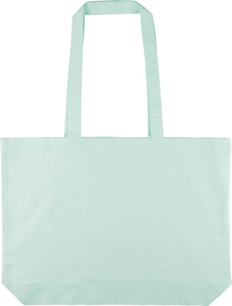 Einkaufstasche aus Baumwolle (140 g/m²) mit 10 cm Seitenfalte und langen Henkeln (70 cm Länge, 2,5 cm Breite). Pastellfarbene Baumwolle in PMS 9562U (grün), 162U (orange), 317U (blau) und 522U (lila). Dieses Produkt ist OEKO-TEX® STANDARD 100 zertifiziert.