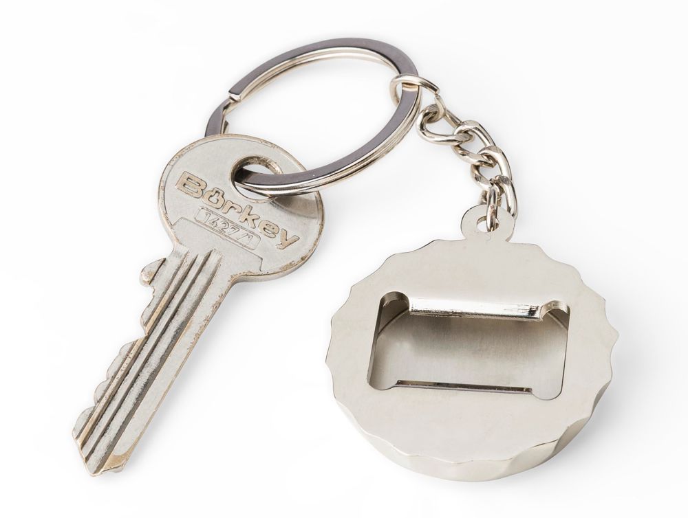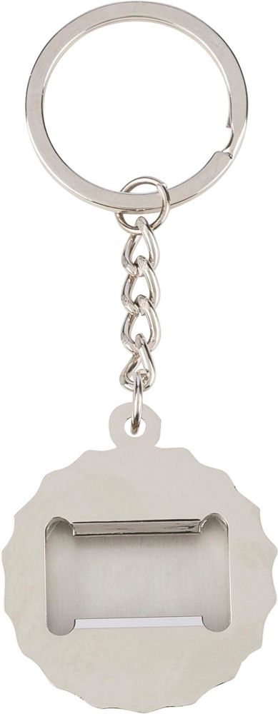 Schlüsselanhänger aus Zinklegierung mit Bambus-Einlage auf der Vorderseite und integriertem Flaschenöffner auf der Rückseite. Mit Metallring und in einer Papiertüte verpackt.