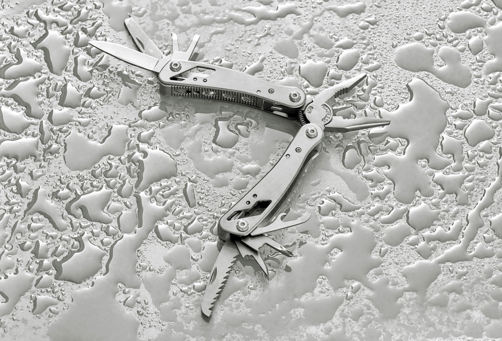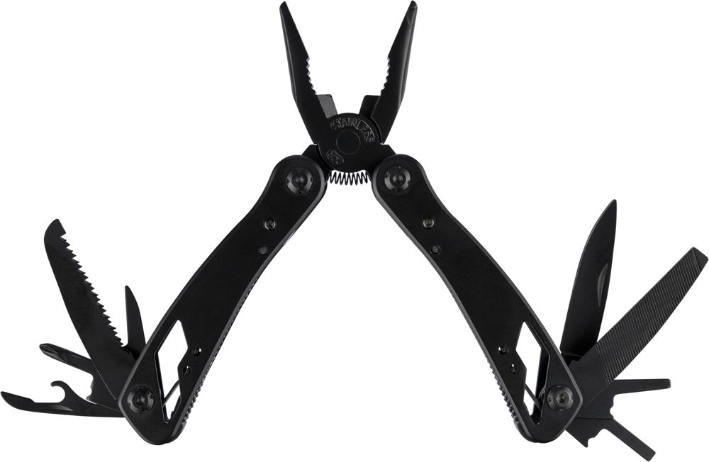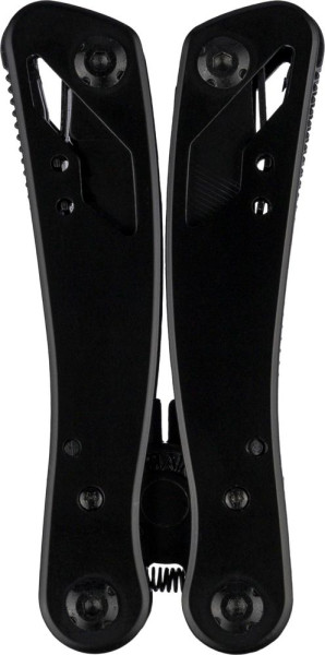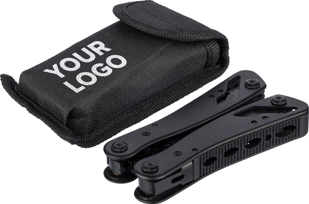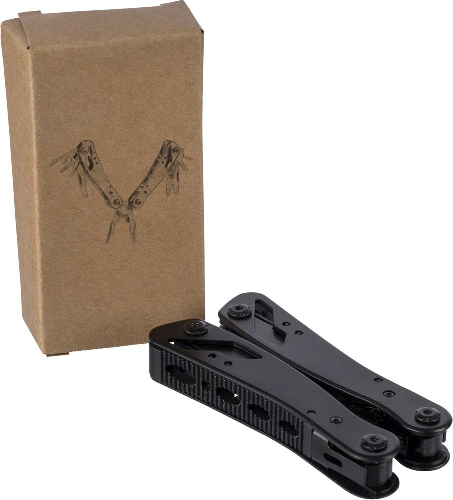 Multifunktionswerkzeug aus schwarzem Aluminium und Edelstahl verfügt über 13 Funktionen, darunter Messer, Schraubendreher, Zange, Säge, Feile, Hebel, Bits, Feder, Schlaufenstange, Dosenöffner und Angel. Es wird mit einer Tasche mit Klettverschluss-Gürtelschlaufe und einer zusätzlichen Außenverpackung geliefert. Es ist einzeln in einem braunen Karton verpackt.