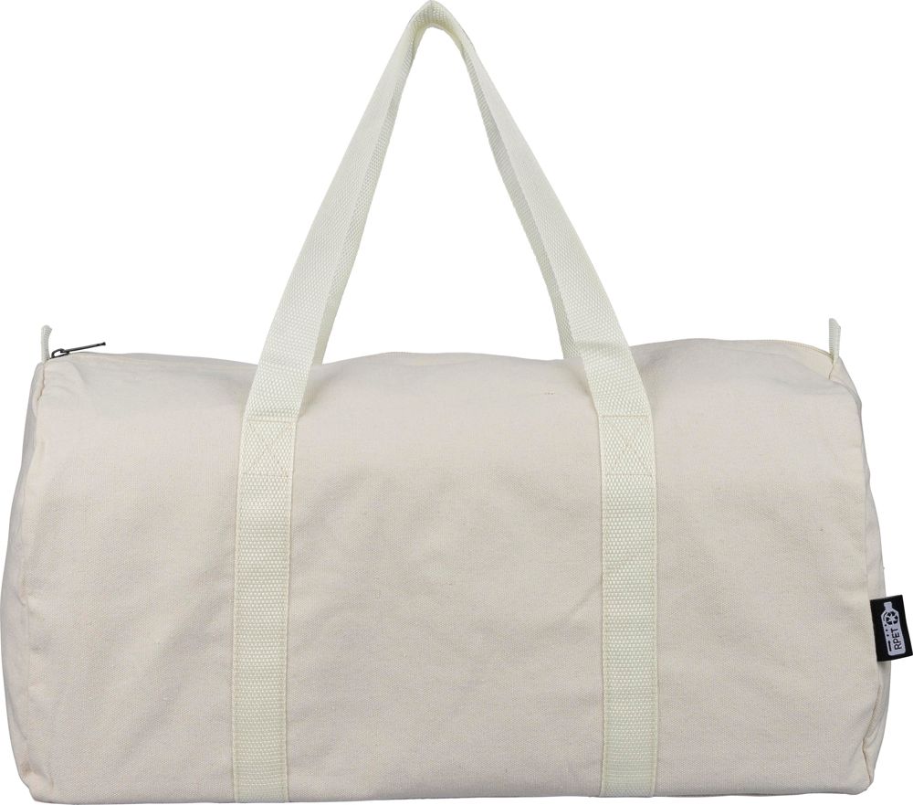 Reisetasche aus recyceltem Polycotton (330 g/m²) mit großem Reißverschlussfach oben. Mit langen Tragegriffen (100 cm lang, 3 cm breit) und passendem Gurtband. Fassungsvermögen ca. 30 Liter. Mit rPET-Etikett außen und Recycling-Etikett innen