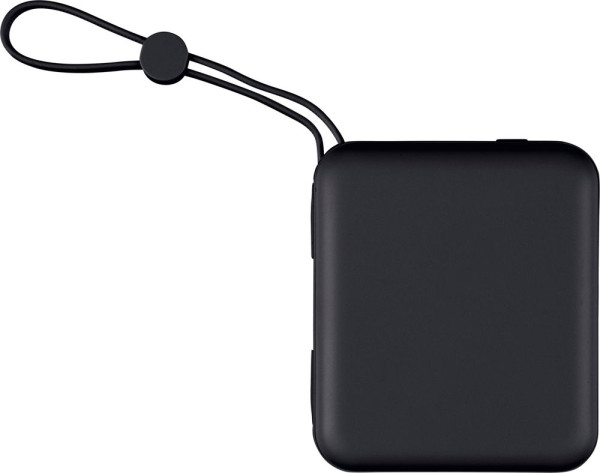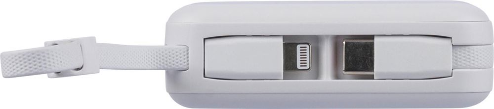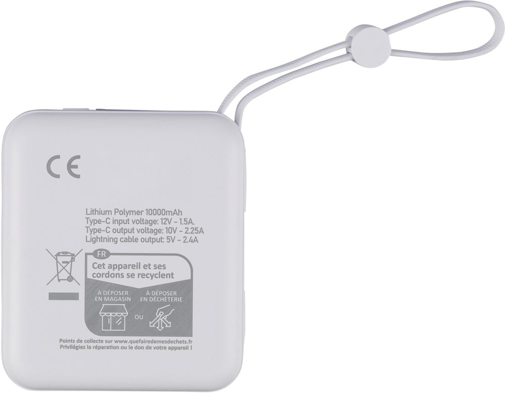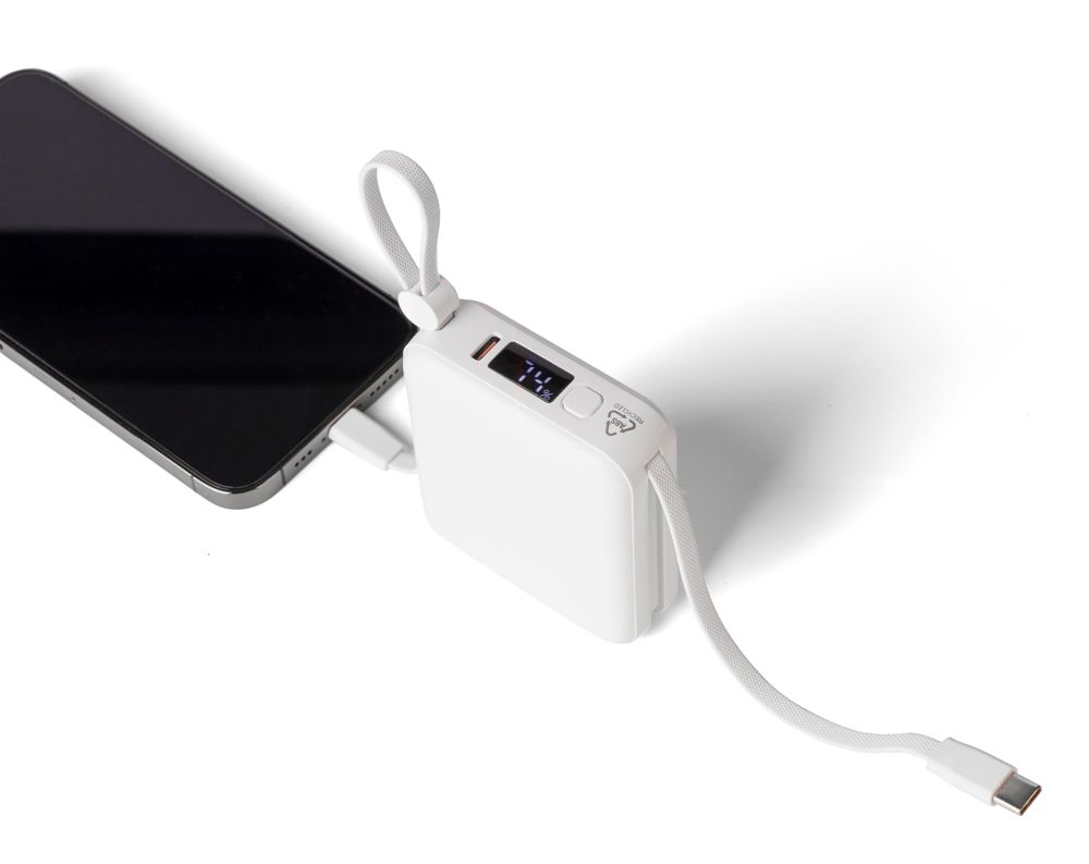 Recycelte Powerbank aus ABS verfügt über einen 10.000-mAh-Li-Ionen-Akku und einen 22,5-W-Schnellladeausgang. Sie ist mit einer integrierten TPE-Trageschlaufe ausgestattet, die gleichzeitig als Ladekabel mit Lightning- und Typ-C-Anschlüssen dient. Auf der Oberseite befindet sich eine digitale LED-Anzeige, die die Akkukapazität anzeigt. Sie verfügt über einen Typ-C-Ein-/Ausgang und einen Typ-A-Eingang. Sie bietet Schutz vor Überhitzung, Kurzschluss, Überspannung und Überstrom. Auf der Rückseite befindet sich ein Etikett mit dem Recycled-ABS-Logo. Sie ist einzeln verpackt in einem braunen Karton mit Seidenpapier im Inneren.