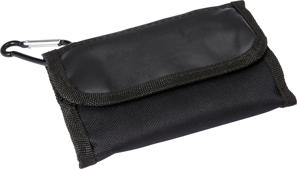 Werkzeug-Set (20-tlg.) in Werkzeugtasche aus Oxfordgewebe (600D) mit Klettverschluss und Karabinerhaken. Das Set besteht aus Schraubendreher (verschiedene Aufsätze), 3 Inbusschlüsseln, 4 Nüssen, 10 Biteinsätzen und Verlängerungsstück.
