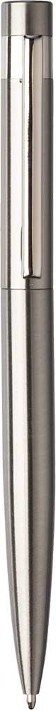 Drehkugelschreiber aus recyceltem Edelstahl, mit einem Logo aus recyceltem Edelstahl auf der Rückseite, mit blauer Tinte. Einzeln verpackt in einer Geschenkbox aus Kraftpapier.