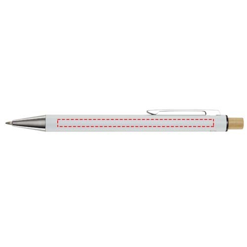Der Cyrus Kugelschreiber ist aus recyceltem Aluminium hergestellt, was weniger Energie benötigt als die Herstellung von Aluminium aus Rohstoffen. Es reduziert außerdem die Abfallmenge auf Mülldeponien und trägt dazu bei, natürliche Ressourcen zu schonen und Treibhausgasemissionen zu reduzieren. Druckknopf ist aus Bambus gefertigt. Tintenfarbe: Schwarz. Schreiblänge: 800 Meter. Spitzengröße: 1,00 mm.