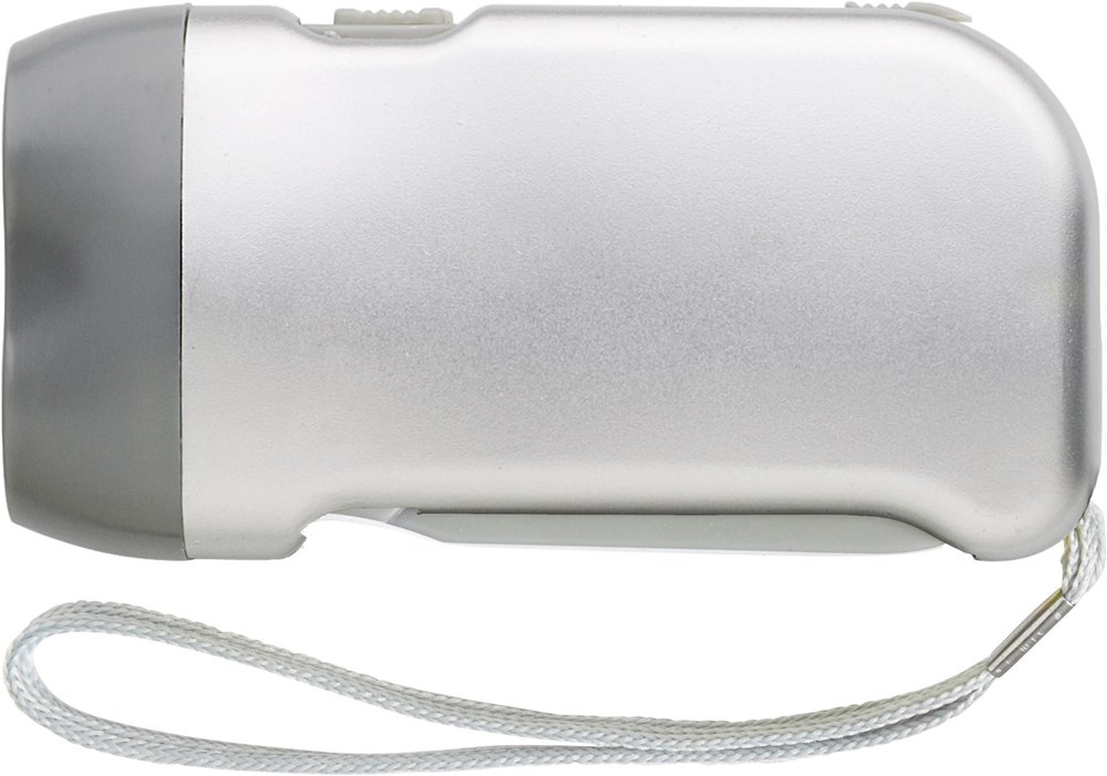 LED-Dynamotaschenlampe aus Kunststoff, mit Handschlaufe.
