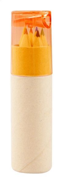 6 Buntstifte mit Anspitzer in rundem Papp-Etui.