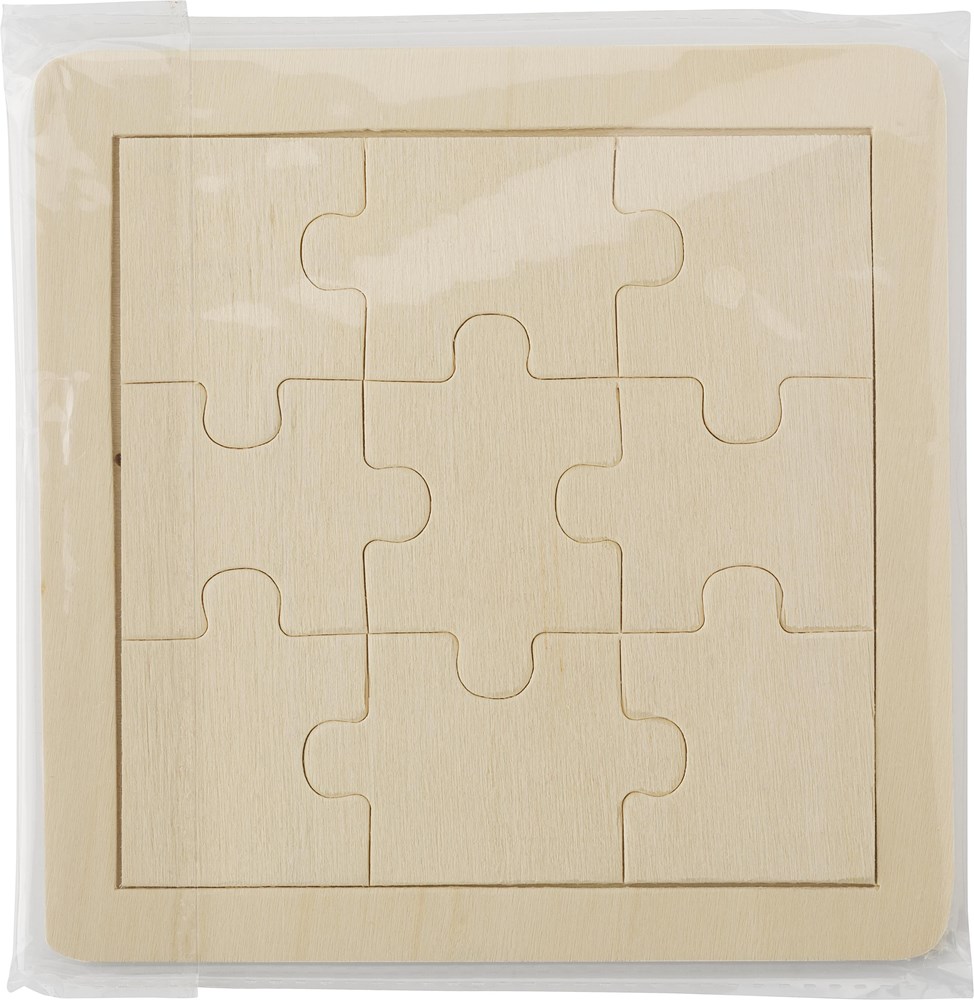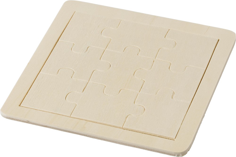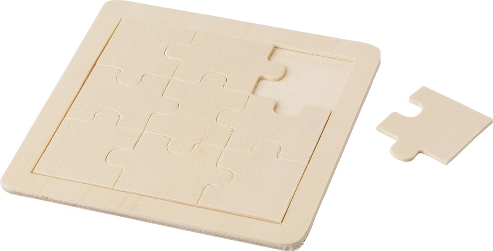 Holzpuzzle mit neun Teilen, in ein Holzbrett gesetzt. Die Puzzleteile können individuell 4-fbg. bedruckt werden.