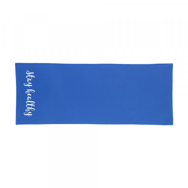 Spezielles Kühlhandtuch aus 100 % Polyester. Nach dem Eintauchen in kaltes Wasser kann dieses Handtuch bei sportlichen Aktivitäten oder Sonnenbrand kühlen. Ideales Format, um es zur Kühlung im Nacken zu tragen. Die Vorderseite des Handtuchs ist in Netzstruktur, die Rückseite ist glatt und hat einen dunkleren Farbton als die Vorderseite.