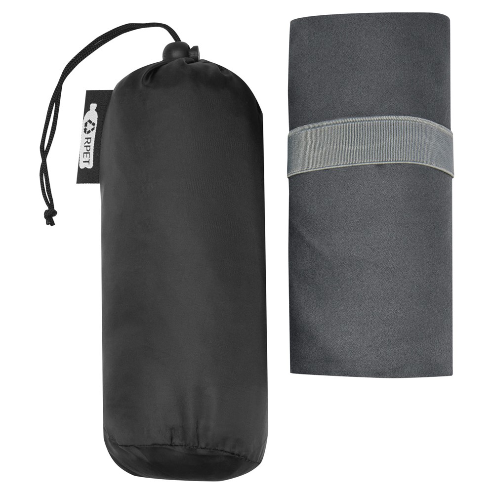 Dieses Sporthandtuch absorbiert sehr gut, ist leicht und trocknet schnell. Darüber hinaus ist der Stoff strapazierfähig und extrem weich. Gefaltet und mit dem Gummiband gesichert ist das Handtuch klein und handlich, gut für Fitnessstudio, Schwimmbad oder für Rucksacktouren und Camping. Das Handtuch hat eine Größe von 130 x 80 cm und besteht aus 200 gr/m2 recyceltem PET-Polyamid. Es kann bei 40 °C in der Waschmaschine gewaschen werden. Das Handtuch wird mit einem Aufbewahrungsbeutel (20 x 8,5 cm) aus recyceltem PET Kunststoff geliefert, der eine große Fläche für den Aufdruck eines Logos bietet.