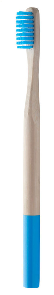 Erwachsenen-Zahnbürste mit Bambusgriff und farbigen Borsten aus Nylon. Mit farblich abgestimmten Verzierungen am Griffende. Verpackt in Kraftpapierbox.