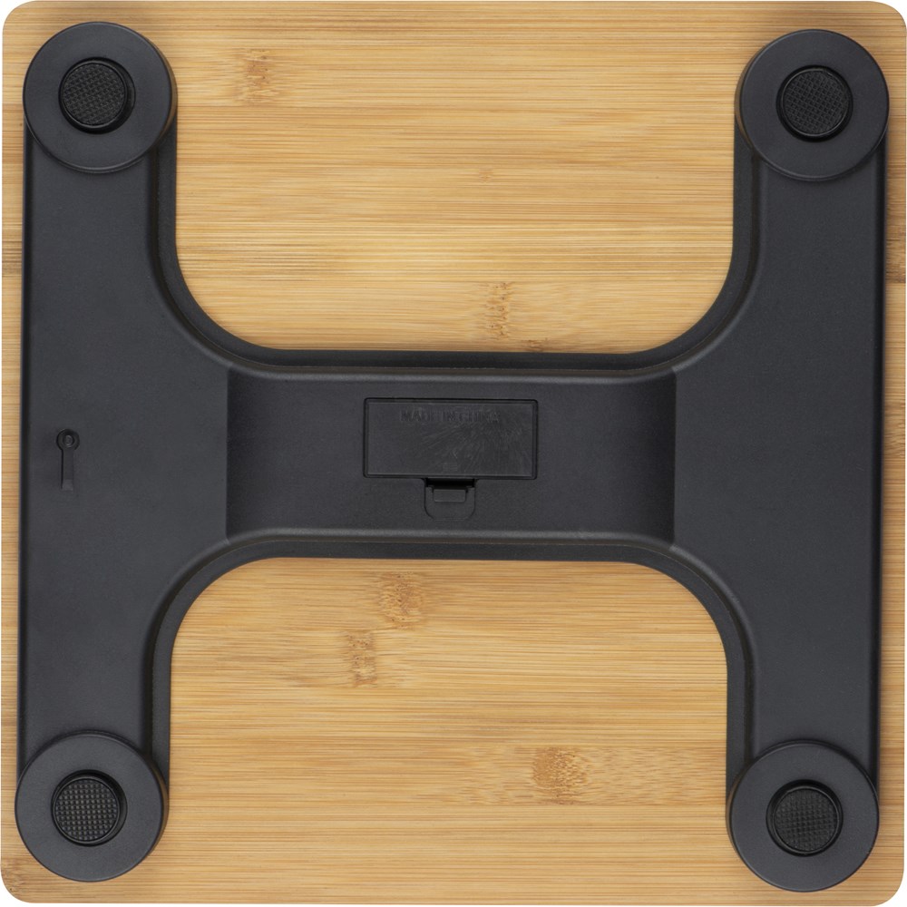 Digitale Personenwaage mit einer Trittfläche aus Bambus und einem maximalen Belastungsgewicht von 150 kg. Anzeige in kg/lb/st möglich. Ihre Werbung wird auf die Waage graviert.