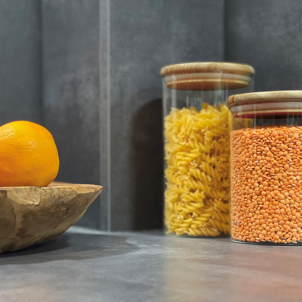 Vorratsdose aus Borosilikatglas mit Bambusdeckel und Silikonring. Mit einem Füllvermögen von... mehr