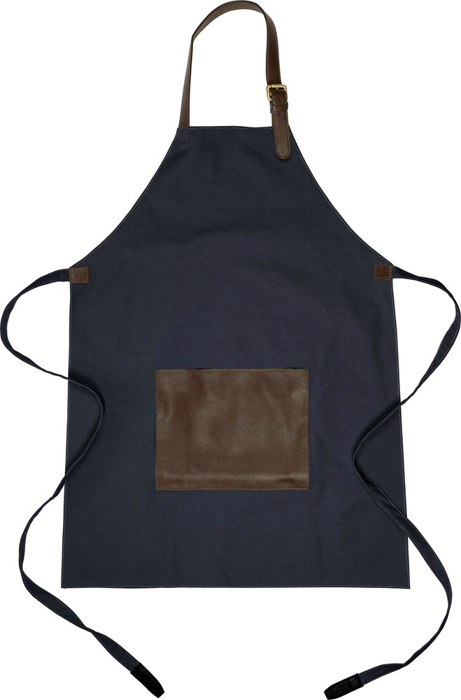 Leinenschürze (450 g/m2) mit rPET-PU-Tasche und verstellbarem Nackenband. Wasserabweisend.