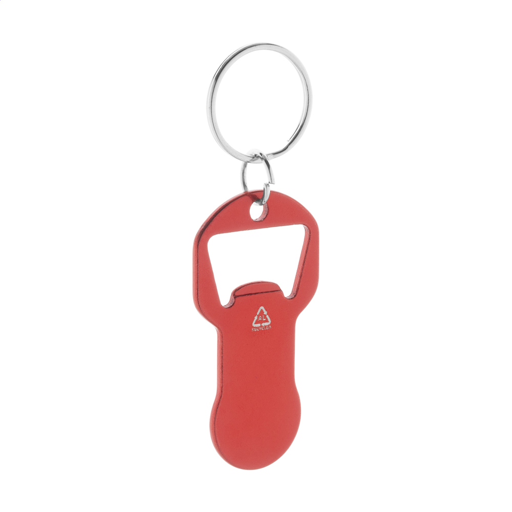 Schlüsselanhänger aus recyceltem Aluminium mit Flaschenöffner und Einkaufswagenchip.