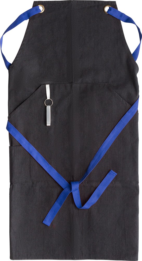 Schürze aus Polyester und Baumwolle mit farbigen Bändern und Fronttasche. Inklusive Flaschenöffner.