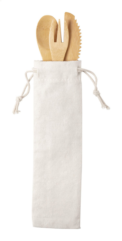 3-teiliges Besteckset aus Bambus im Baumwollbeutel.