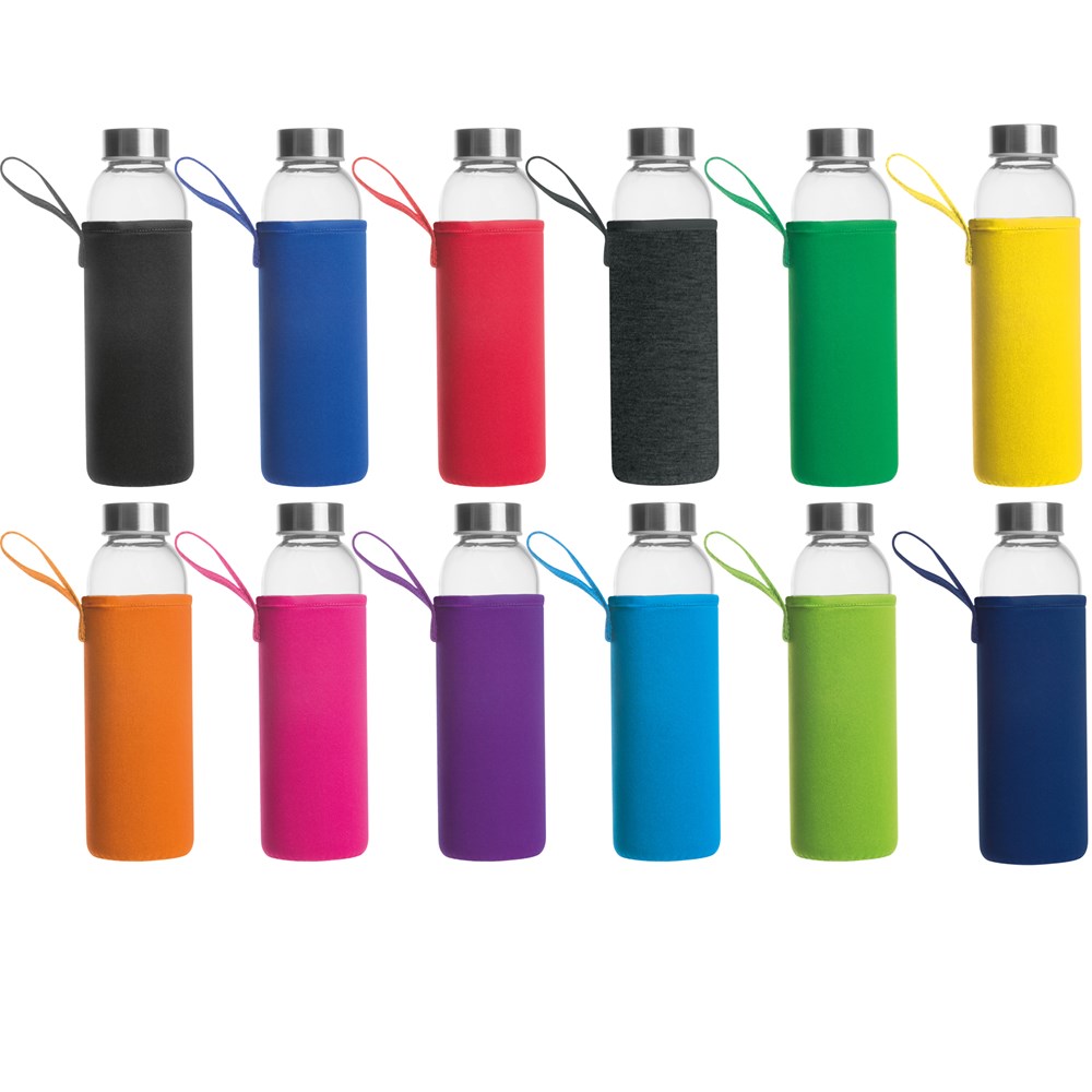Auslaufsichere Trinkflasche aus Glas mit Edelstahldeckel und einem Fassungsvolumen von 500 ml. Die Flasche wird in einer passenden Neoprenhülle mit Trageschlaufe geliefert. Ihre Werbung drucken wir mittig auf die Hülle. Gravur auf dem Deckel oder der Flasche sowie Druck auf der Flasche auf Anfrage möglich.
