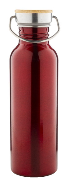 Farbige Edelstahl-Trinkflasche mit Tragedeckel aus Bambus. Füllmenge: 800 ml.