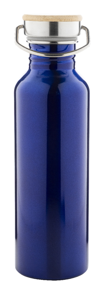 Farbige Edelstahl-Trinkflasche mit Tragedeckel aus Bambus. Füllmenge: 800 ml.