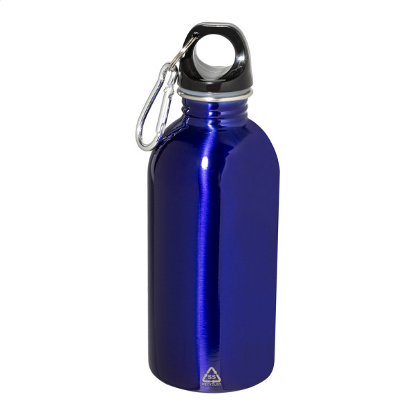 Recycelte Edelstahlflasche mit Aluminiumkarabiner. Füllmenge: 400 ml.