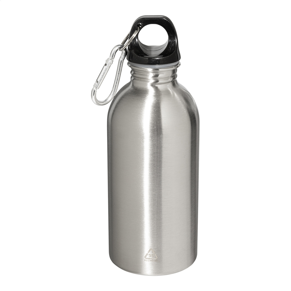 Recycelte Edelstahlflasche mit Aluminiumkarabiner. Füllmenge: 400 ml.
