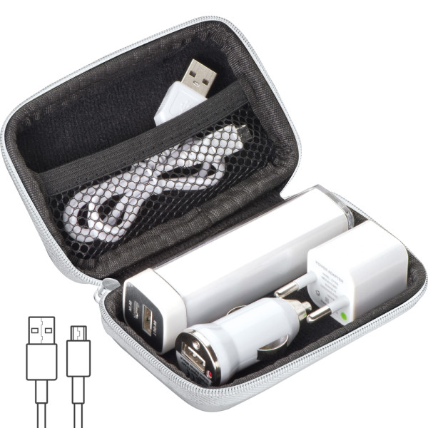 Reiseset bestehend aus einem KFZ-USB Adapter, einem Netzstecker und einer Powerbank (2.200 mAh) aus Kunststoff inkl. USB-Ladekabel. Alles praktisch verpackt in einem Etui. Ihre Werbung drucken wir auf die Außenseite des Etuis.