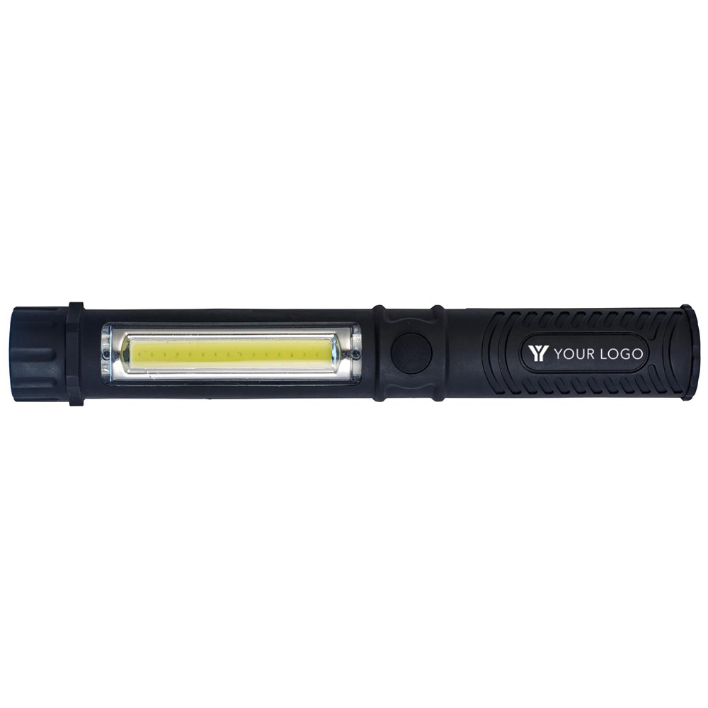 Arbeitslampe aus Kunststoff, mit runder COB-Leuchte vorne und einem COB-Leuchtstreifen an der Seite, Magnet und Kunststoffclip.