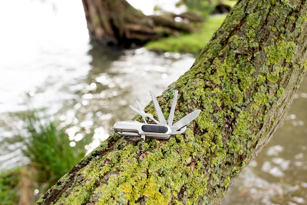 Taschenmesser aus rostfreiem Stahl, 11-tlg., bestehend aus Flaschenöffner, Korkenzieher, Kreuzschraubendreher, zwei Sägen, Schere, drei Messern und Drahtbinder.