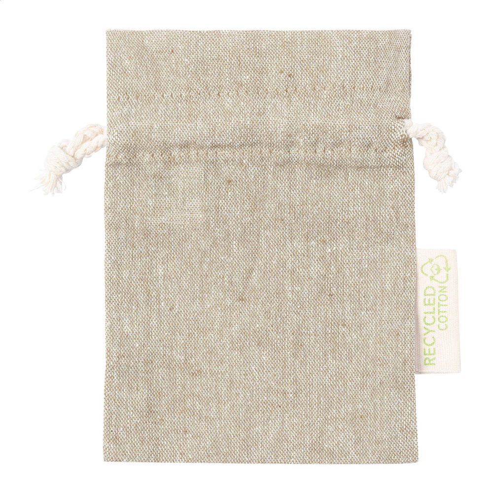 Geschenkbeutel aus recycelter Baumwolle mit Kordelzugverschluss. Mit Lable recycelte Baumwolle. Material: 100 % recycelte Baumwolle, 120 g/m².