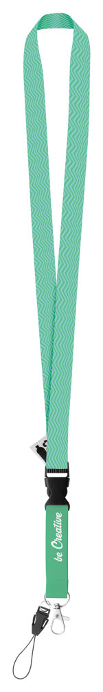 Individuelles Lanyard aus RPET mit abnehmbaren Metallkarabiner und Handyfaden. Der Preis ist inkl. Sublimationsdruck auf beiden Seiten. Mindestmenge: 100 Stk.