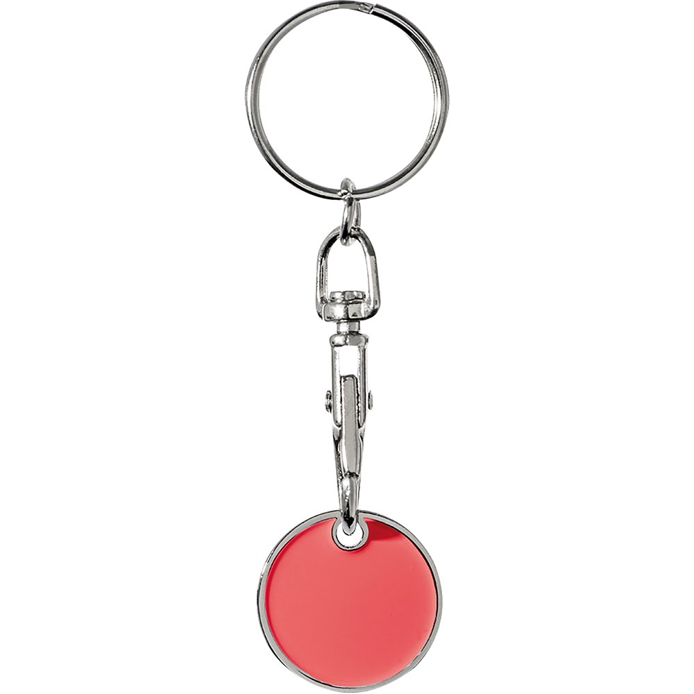 Schlüsselanhänger mit einem durch einen Karabinerhaken abnehmbaren Einkaufswagenchip. Die eine Seite des Chips ist farbig. Ihre Werbung gravieren wir auf die silberne Seite des Chips.