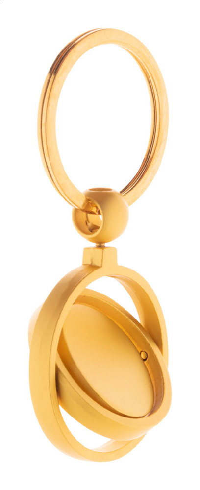 Metallschlüsselanhänger mit goldfarbener Oberfläche und rotierenden Innenteilen. Einzeln in Kraftpapierbox.