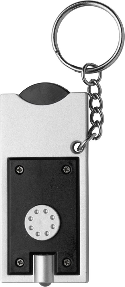 Schlüsselanhänger aus Kunststoff, mit Einkaufswagenchip aus Kunststoff, LED-Lampe (weiß) und Metall-Schlüsselkette.