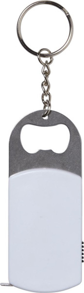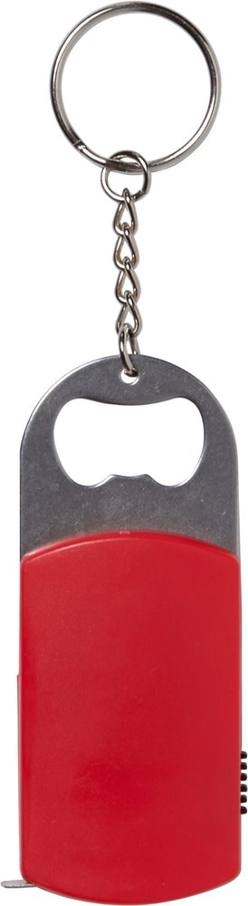 Schlüsselanhänger aus Kunststoff, mit LED-Lampe (weiß), Flaschenöffner aus Metall, Maßband (Länge ca. 1 m) und Metall-Schlüsselkette.