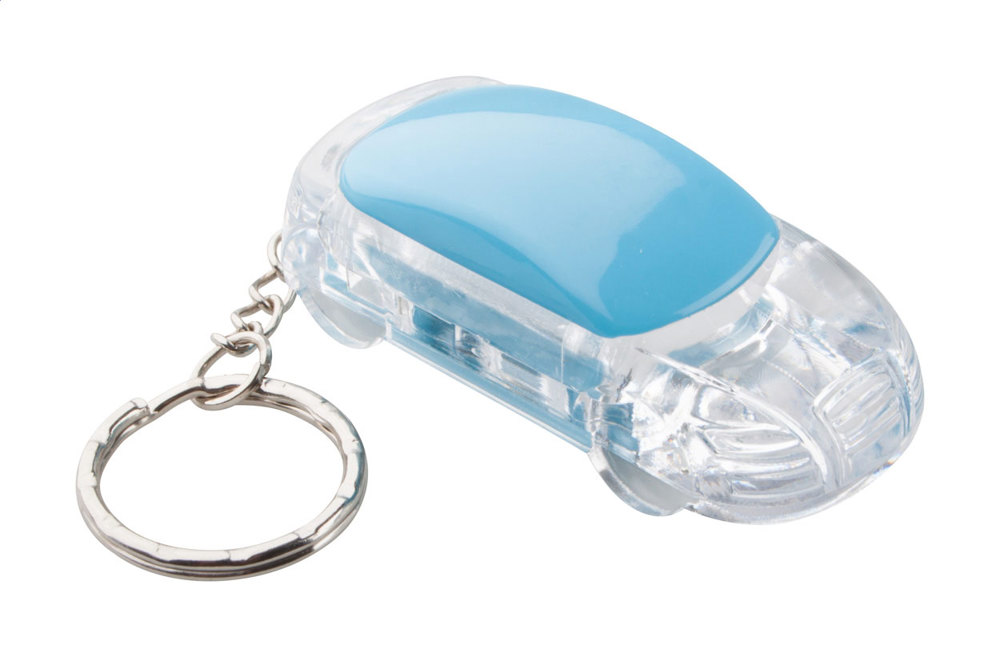 Schlüsselanhänger aus Kunststoff in Autoform mit weißem LED-Licht und Metall-Schlüsselring. Inkl. Knopfzellenbatterie.