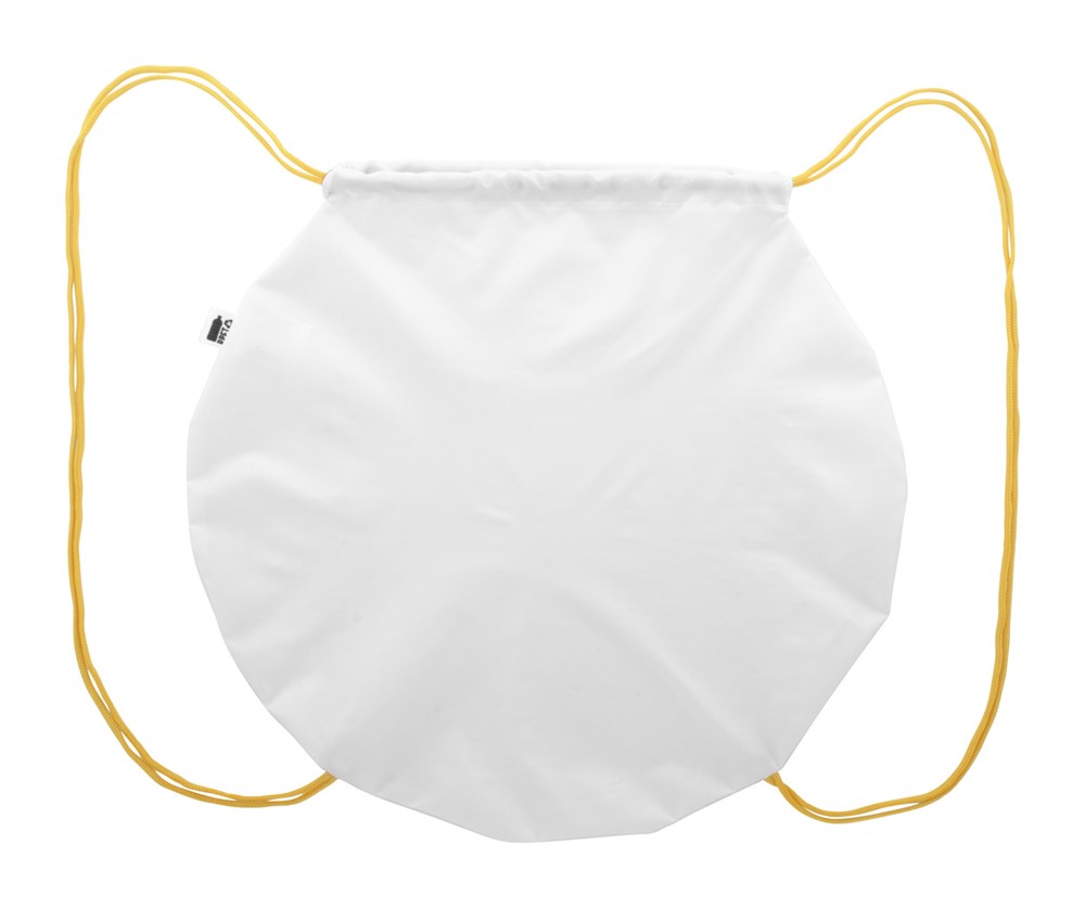Individueller, ballförmiger Beutel mit Kordelzug und farbigen Kordeln, 190T RPET-Polyester. Mit vollflächigem Sublimationsdruck und RPET-Label. Mindestmenge: 25 Stück.