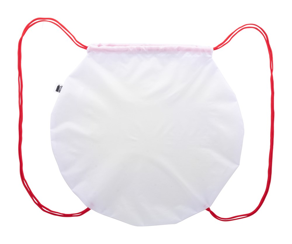 Individueller, ballförmiger Beutel mit Kordelzug und farbigen Kordeln, 190T RPET-Polyester. Mit vollflächigem Sublimationsdruck und RPET-Label. Mindestmenge: 25 Stück.