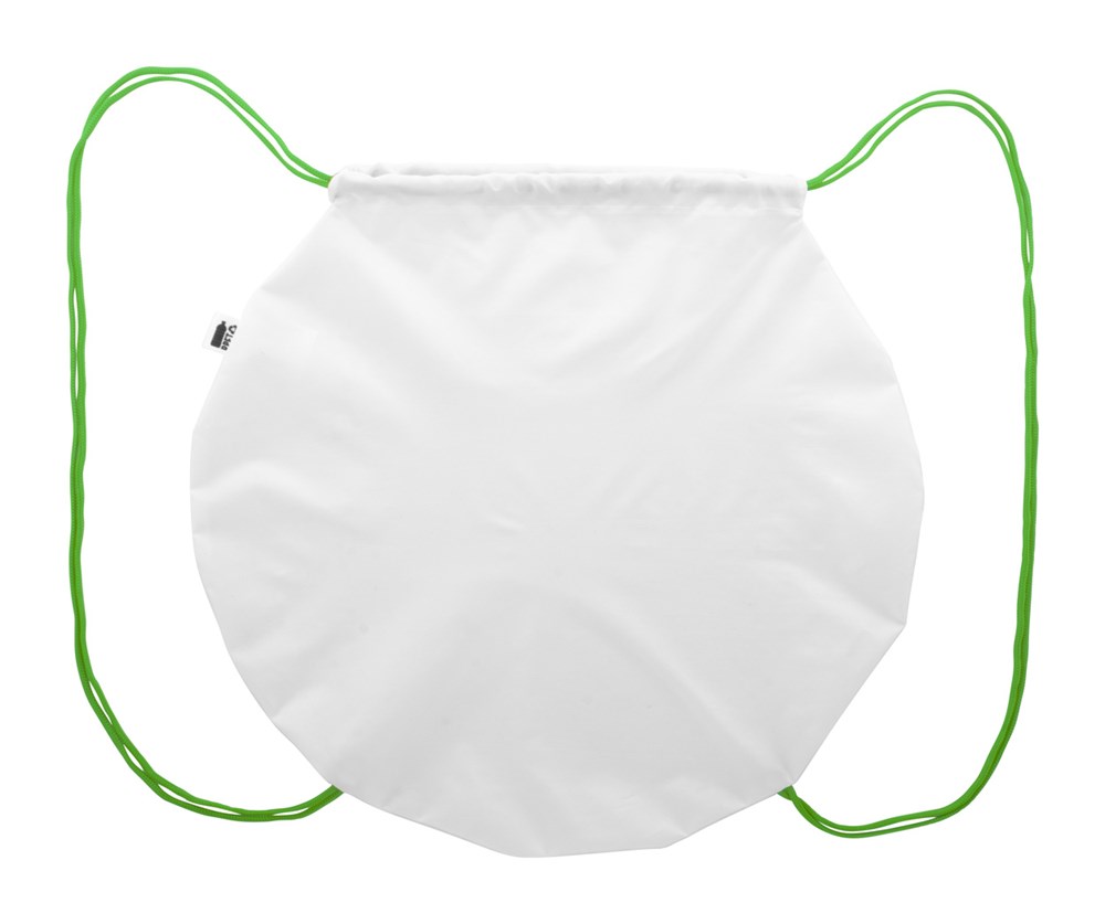 Individueller, ballförmiger Beutel mit Kordelzug und farbigen Kordeln, 190T RPET-Polyester. Mit vollflächigem Sublimationsdruck und RPET-Label. Mindestmenge: 25 Stück.