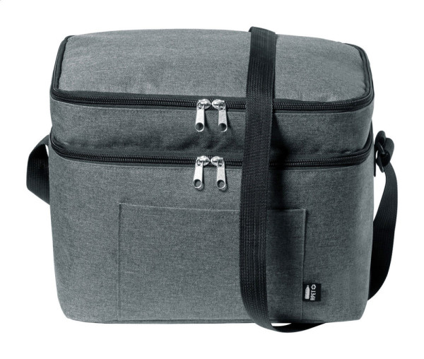 Kühltasche aus 600D RPET Polyester mit PEVA-Polsterung, 2 Reißverschluss-Fächern, einstellbarem Schultergurt und RPET-Label.