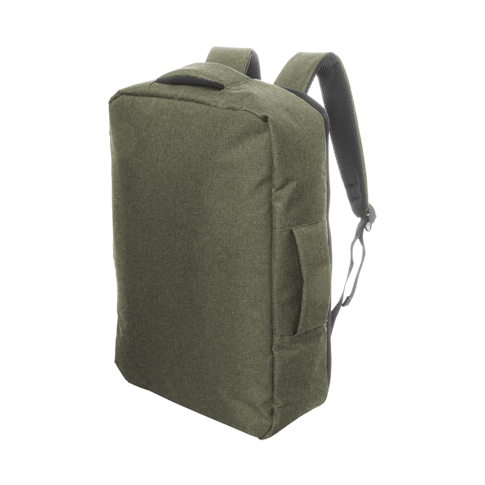 RPET-Rucksack mit Doppelfunktion und Dokumententasche mit Reißverschlussfach und gepolstertem Laptopfach (15"). Mit Trolley-Gurt, gepolstertem Rücken und Schultergurten. Material: 300D RPET-Polyester. Mit RPET-Label.