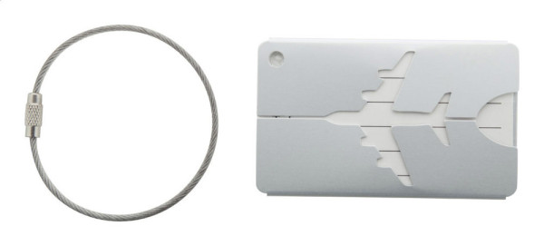 Kofferanhänger mit Flugzeugmotiv aus Aluminium und Schnur aus Metall.