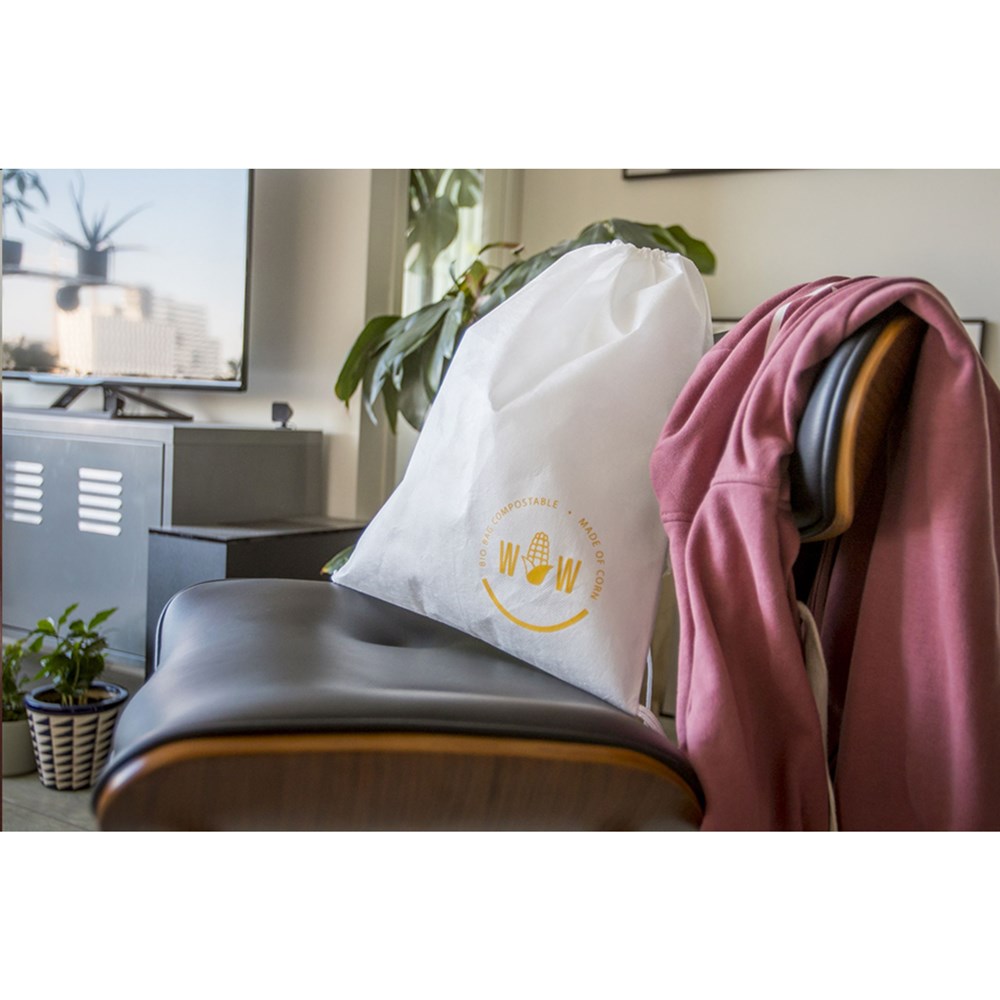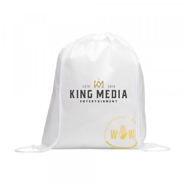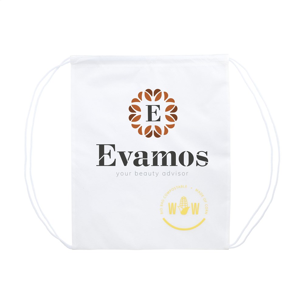 Rucksack aus Maisabfällen, PLA-Material aus Maisstärke. Mit Zugkordel. Fassungsvermögen ca. 8 Liter. Das Nebenprodukt von Mais wird PLA genannt. PLA (Polyactinic Acid) wird normalerweise aus den Zuckern in Maisstärke, Maniok oder Zuckerrohr hergestellt. PLA ist 100% biologisch abbaubar und 100% kompostierbar. Um aus Mais eine Art Kunststoff (PLA) zu machen, werden die Maiskörner mit Schwefeldioxid in heißem Wasser vermischt, damit sich alle Bestandteile dieser Mischung wieder zu Stärke, Proteinen und Fasern entwickeln. Aus den Fasern wird Garn hergestellt und daraus kann ein Beutel entwickelt werden. Standardmäßig ist das Logo von „bio bag compostable – made of corn“ auf die Tüte gedruckt.
