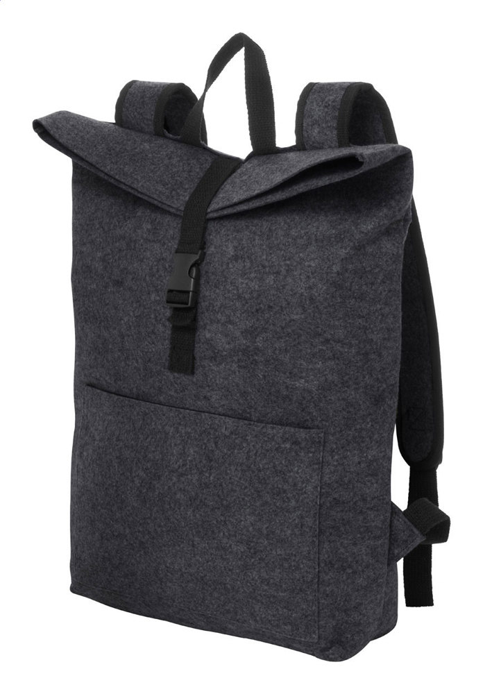 Rolltop-Rucksack aus RPET Filz mit Schnallenverschluss am Hauptfach, Reißverschluss-Fronttasche, Laptopfach (15") und gepolsterten Schultergurten. Mit RPET-Label.