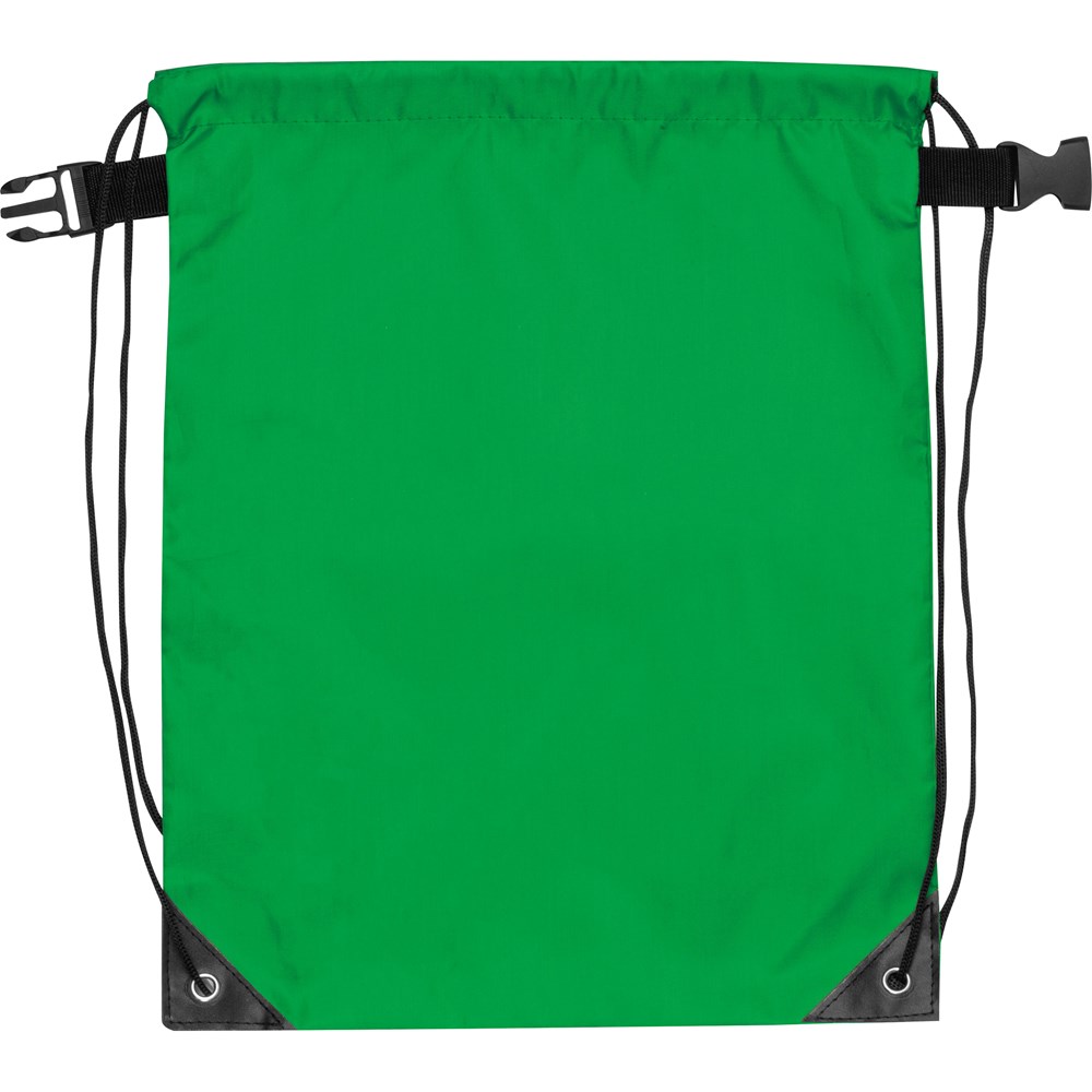 Sportbeutel aus recyceltem PET. Der Beutel verfügt neben den Schulterriemen und den verstärkten Ösen noch über einen zusätzlichen Klickverschluss oben. Hiermit läßt sich der Beutel bequem z.B. an einem Rucksack, einem Trolley usw. befestigen. Ihre Werbung drucken wir mittig auf eine Seite.