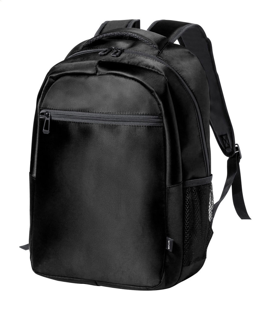 Rucksack aus RNYLON mit Reißverschlussfächern, Netz-Seitenfächern, gepolstertem Laptopfach (15"), Trolleygurt, gepolstertem Rücken und Schultergurten. Material: 420D Recyceltes Nylon mit RNYLON-Label.