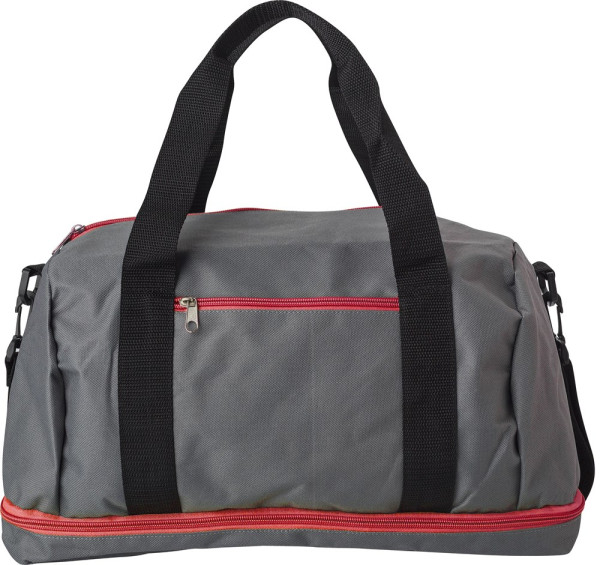 Kleine Sporttasche aus Polyester (600D) mit einer Reißverschlusstasche und einem separaten Schuhfach an der Unterseite. Die Tasche hat zwei Henkel und einen verstellbaren Schulterriemen.