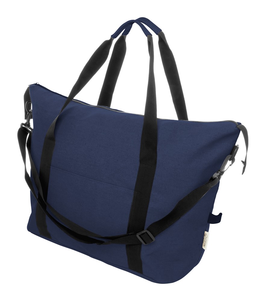 Reise-/Sporttasche aus recycelten Canvas mit Hauptfach mit Reißverschluss, Vordertasche, verstellbarem Schultergurt und Reißverschlusstasche auf der Rückseite, die auch als Trolleygurt dient. 70 % recycelter Baumwolle und 30 % RPET-Polyester. Mit Label recycelte Baumwolle.