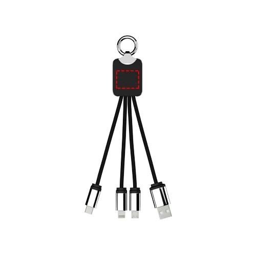 Beleuchtetes Logo-Ladekabel mit Gummi- und Metalloberfläche, ausgestattet mit drei Anschlüssen (Typ-C, Android, iPhone). Es können bis zu drei Geräte gleichzeitig geladen werden. Länge der Kabel (einschließlich Stecker): 10 cm. Kabel aus recyceltem PET-Kunststoff und die Verpackung besteht aus recyceltem Papier und recyceltem Kunststoff.